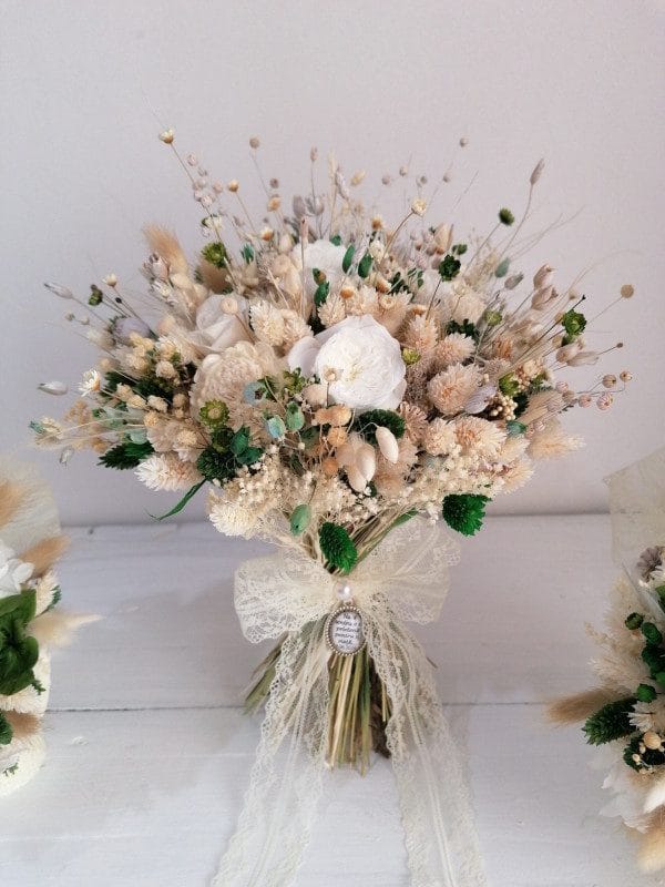 Acest buchet unic de flori criogenate, în nuanțe delicate de alb și verde, este special conceput pentru mirese care doresc să adauge un strop de eleganță și naturalețe ținutei lor. Realizat manual cu atenție la fiecare detaliu, buchetul îmbină frumusețea florilor naturale cu durabilitatea celor criogenate, astfel încât să rămână impecabil în timp.