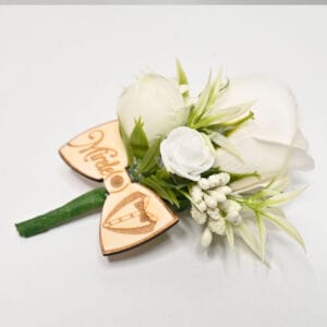 Realizată manual cu o atenție deosebită la detalii, cocarda integrează trandafiri albi impecabili, simbol al purității și al noilor începuturi. Elementul central care atrage privirea este papionul din lemn personalizat, gravat cu precizie, care adaugă o notă modernă și rustic-șic întregului ansamblu.
