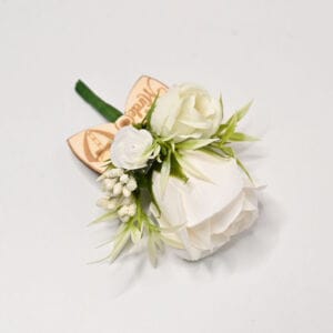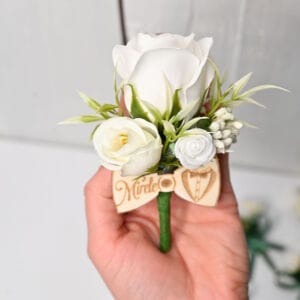 Completează ținuta de nuntă cu un accesoriu plin de personalitate și rafinament. Această cocardă pentru mire este mai mult decât un simplu accesoriu floral; este o piesă simbolică ce îmbină delicatețea florilor cu textul cald al lemnului gravat.