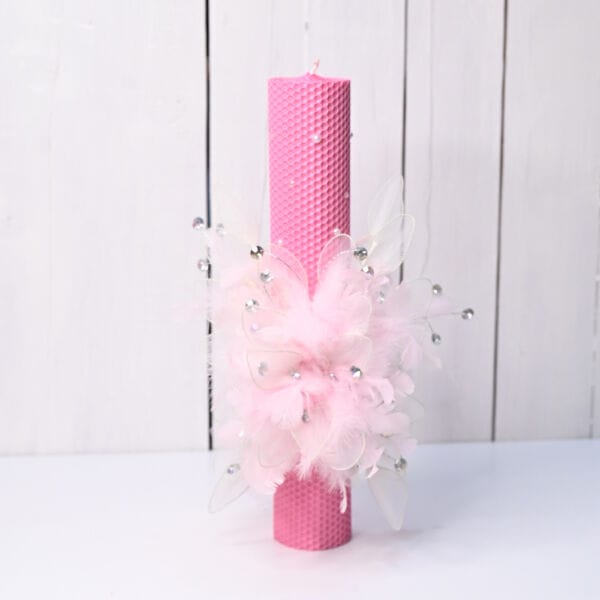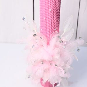 Lumanare Botez din Fagure Roz – „Sweet Angel” cu Aripi de Fluture, Pene și Cristale