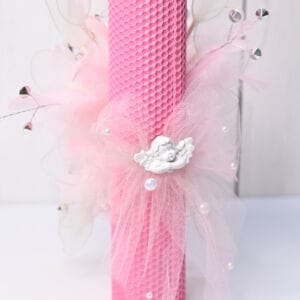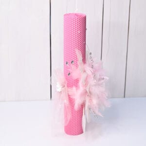 Lumânarea „Sweet Angel” transformă momentul botezului într-o poveste vizuală de neuitat. Realizată din ceară cu model de fagure, aceasta se remarcă prin textura sa unică și culoarea roz aprins, simbolizând bucuria și delicatețea noului început.