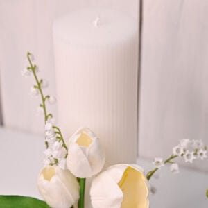 Culoare: Alb perlat (lumânare) și alb natural (flori).