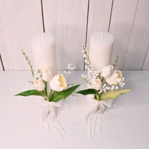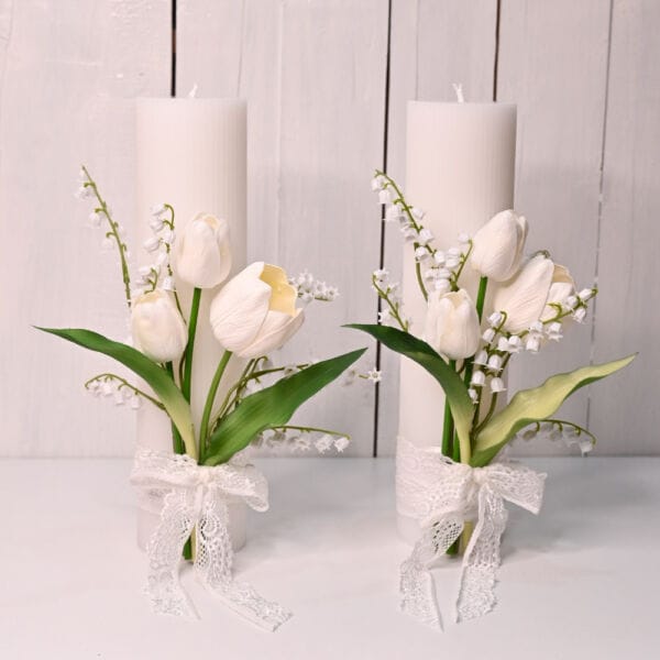 Lumânări Cununie 30cm cu Lalele Albe și Lăcrămioare – Set 2 Bucăți