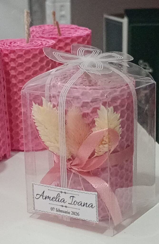 Mărturii lumânări fagure roz (Pink Coral) cu plante uscate – Eleganță naturală pentru evenimente de neuitat